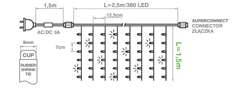 • gruby, gumowy przewód to gwarancja, że kurtyna przetrwa lata, a nie jeden sezon. Ten kabel jest bardziej odporny na uszkodzenia i warunki atmosferyczne, dzięki czemu zapewni Ci bezproblemowe użytkowanie.
